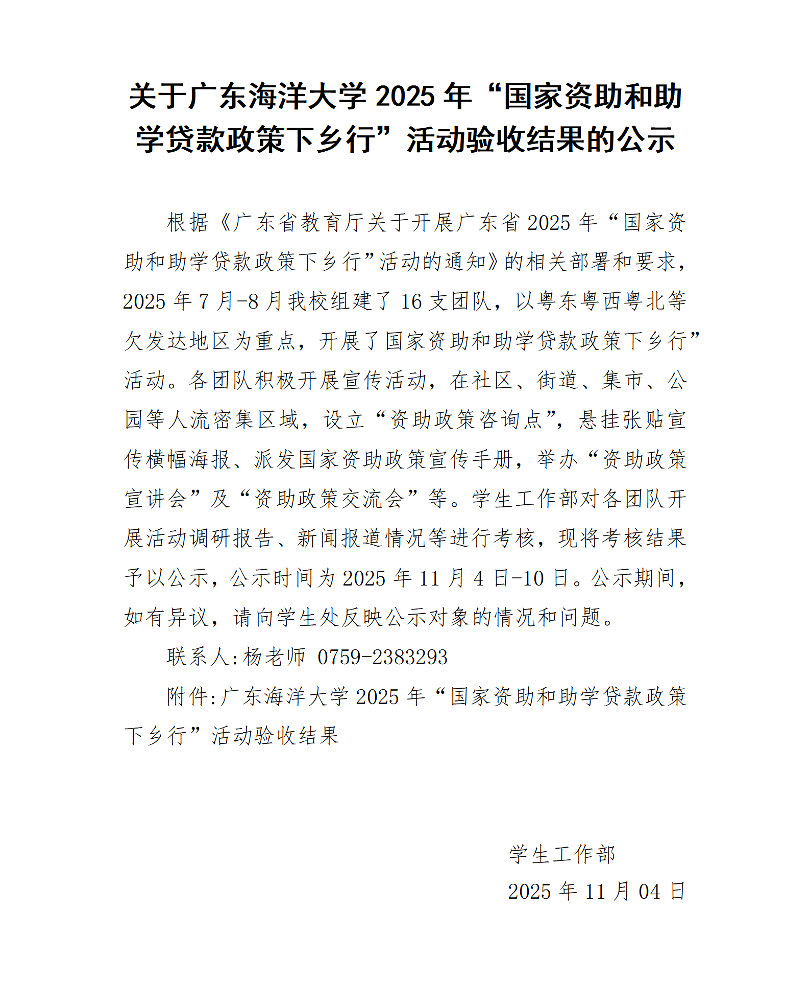 关于广东海洋大学2025年“国家资助和助学贷款政策下乡行”活动验收结果的公示