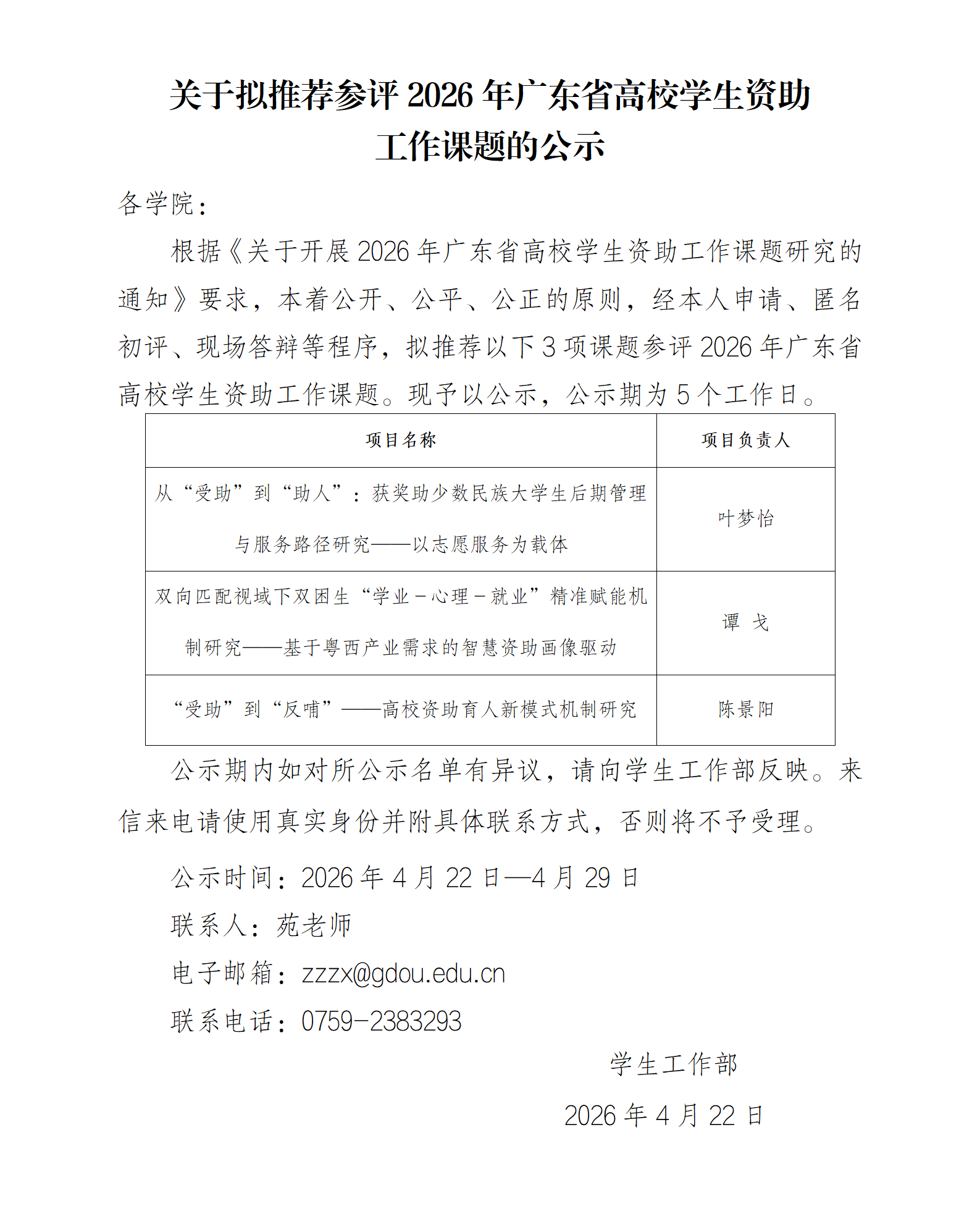 关于拟推荐参评2026年广东省高校学生资助工作课题的公示